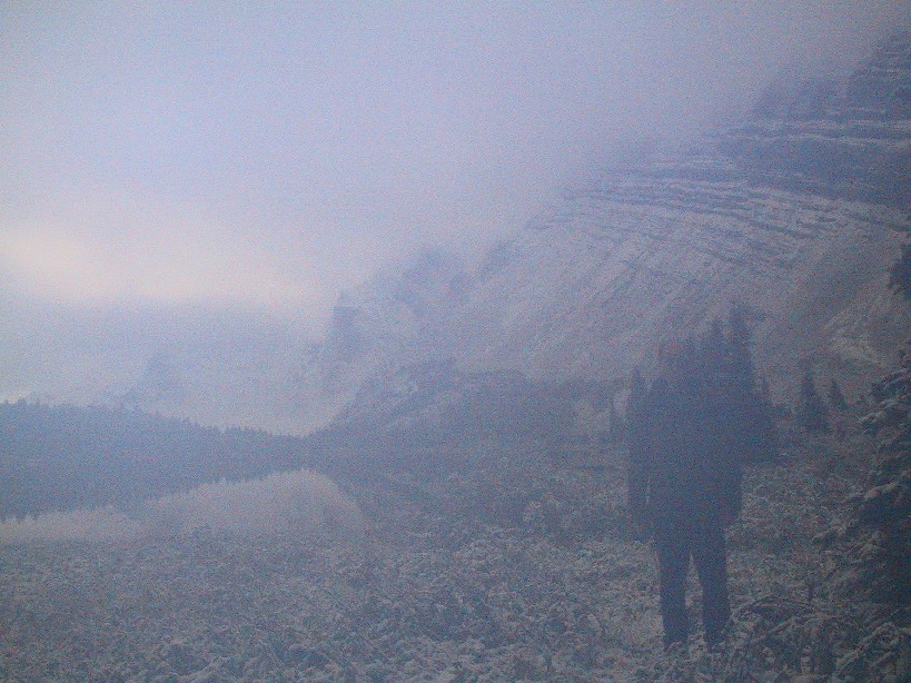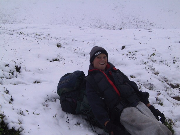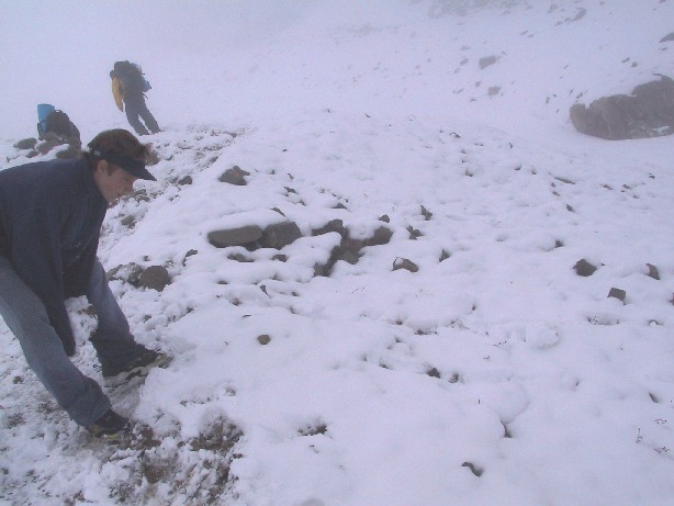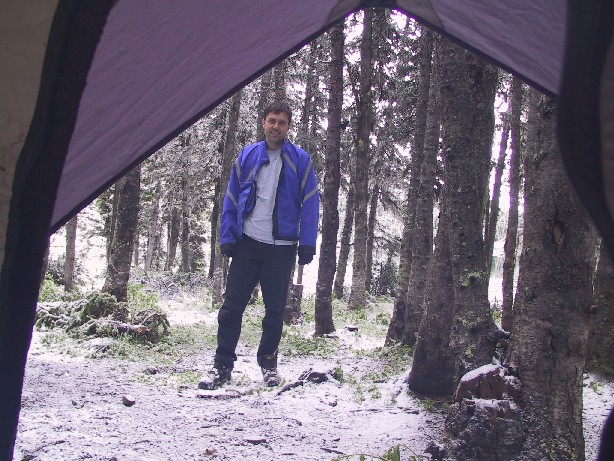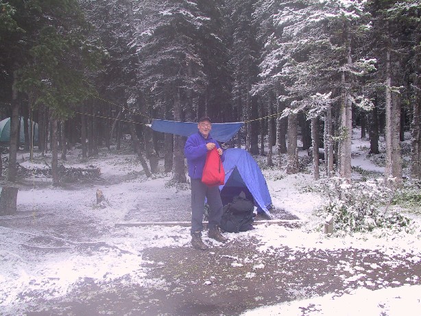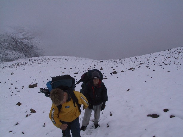 greeted us with a fresh blanked of snow. We used the remaining fuel and a bit from Dave's supply to heat the insides of the tents enough to dry